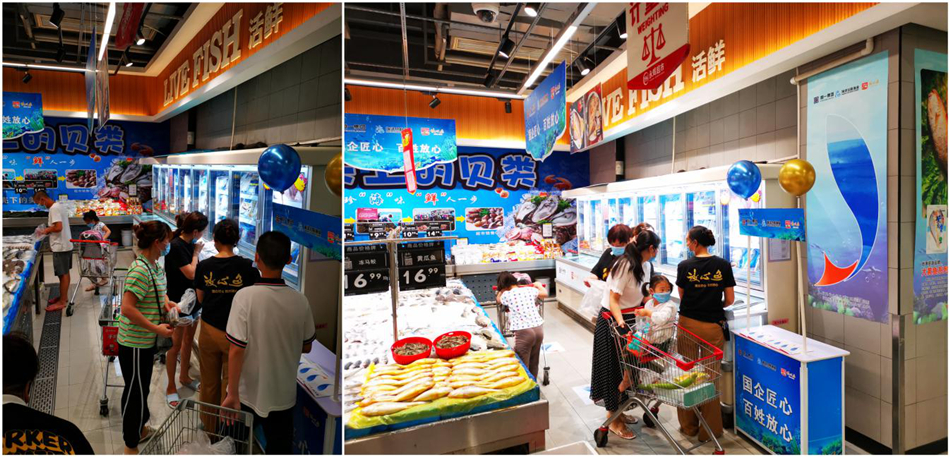 经过近一周的精心筹备,富有放心鱼品牌和产品特色的引导地贴、吊牌、展示台、墙面海报、宣传册,以及用于赠送的五彩气球等各类展示物料均已布置完毕,顾客从入口处即可跟着地上醒目的放心鱼地贴步入生鲜区,“国企匠心、百姓放心”的标语口号随处可见,货柜里摆满了放心鱼系列目前销售最好的大黄鱼、黄鱼鲞等拳头产品。12日活动启动当天,新天宇门店的所有放心鱼产品一早即已被热情的顾客抢购一空,至傍晚时已两次补货,其他门店的活动也成功吸引了众多顾客的注意力,现场销售情况较平时更为火爆。