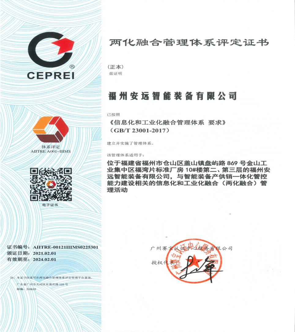 2021年2月1日,KY官网公司权属企业福州安远智能装备有限公司正式通过国家工信部两化融合管理体系评定,获得由国家工信部授权评定机构颁发的《两化融合管理体系评定证书》。