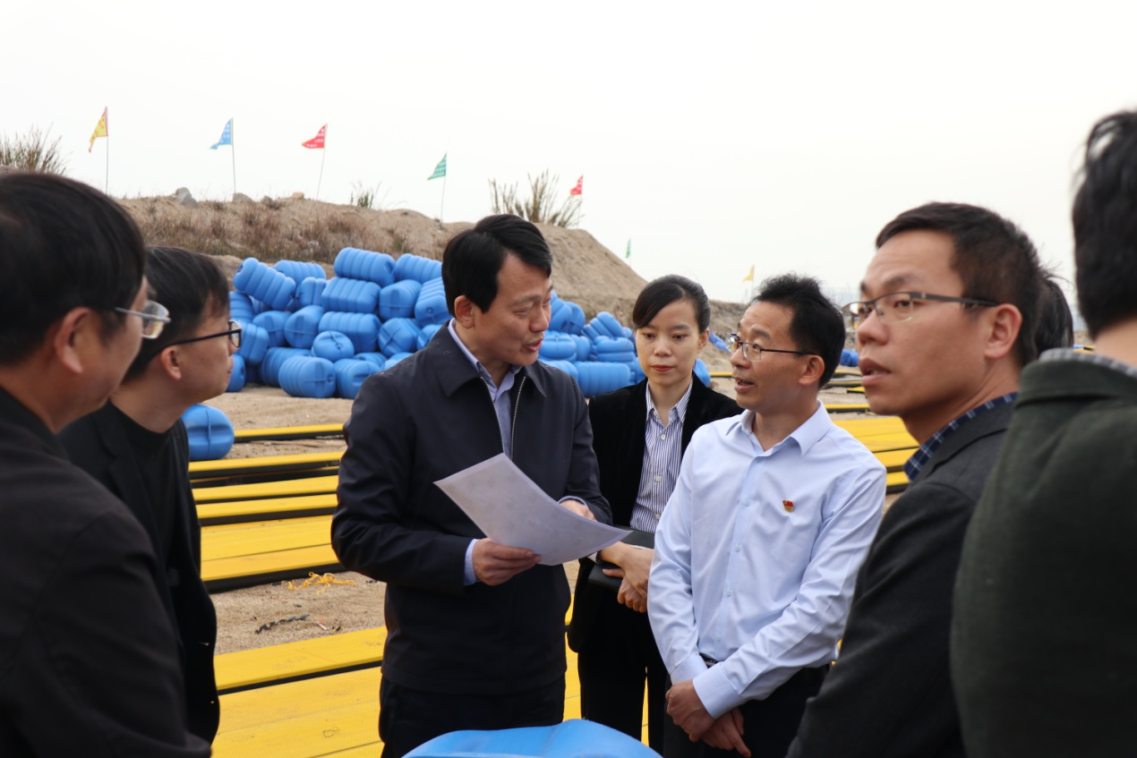 2月25日下午,泉州市海洋与渔业局党组书记陈龙津一行深入福州安远智能装备有限公司泉港区新型塑胶网箱改造升级项目一线调研指导,安远公司总经理刘华虎、副总经理刘茂荣陪同调研。