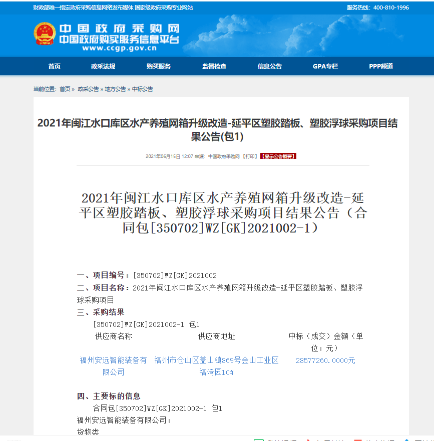 2021年6月15日,KY官网公司权属企业安远公司成功中标闽江水口库区水产养殖网箱升级改造-延平区塑胶踏板、塑胶浮球采购项目。该项目将在延平区漳湖镇龙池、坂头、林经、上坂、中和等14个村开展网箱升级改造工作,改造总面积达60万平方米。