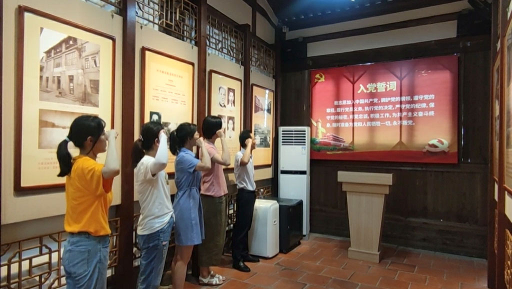 在中共福州市委旧址党史馆内,安远公司党支部书记刘华虎带领全体党员重温入党誓词。党员们以铿锵有力的誓言,表达了自己坚定不移、永远跟党走的理想信念和发扬革命传统,牢记初心使命的坚定决心。