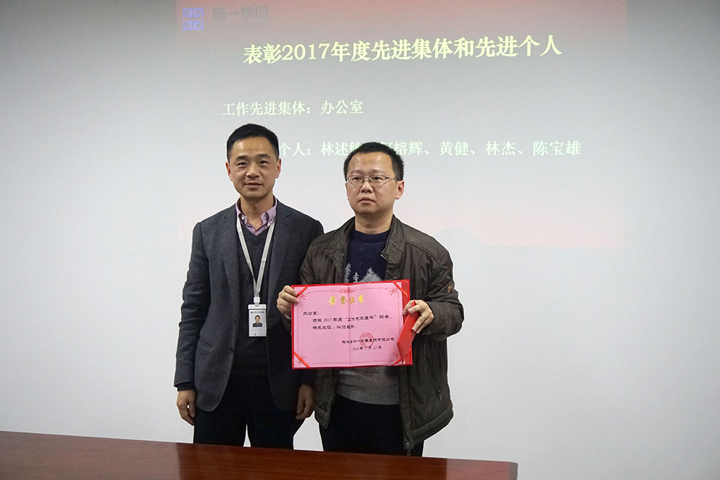 集团党总支副书记黄贤华宣读公司关于表彰2017年度工作先进集体和先进个人的决定,号召公司广大员工要以先进集体和先进个人为榜样,开拓创新、积极进取,努力为公司发展更上新台阶,做出更大贡献。